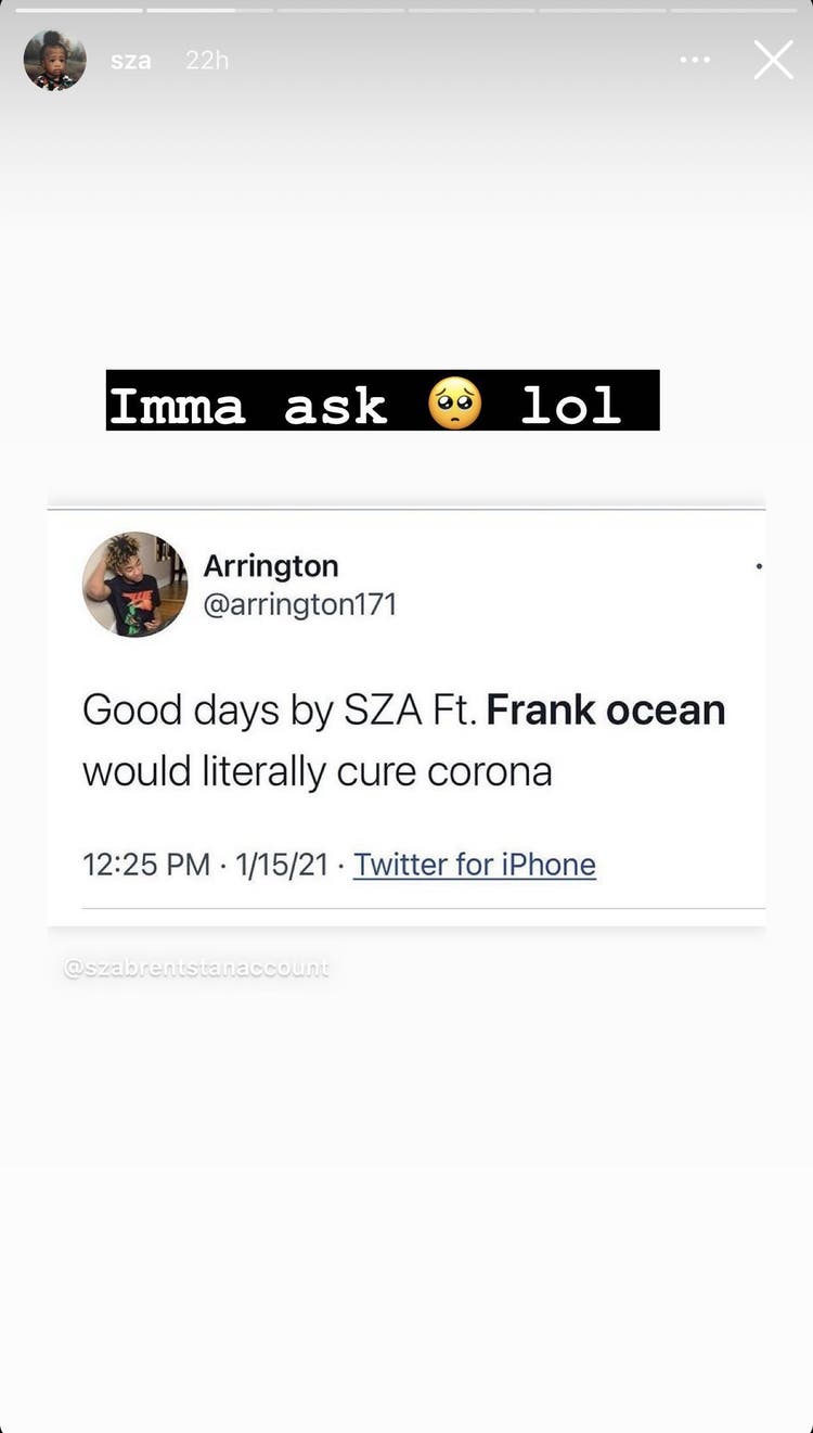 It all started when a fan pitched the collaboration, which included a possible way to end the COVID-19 pandemic. “‘Good days’ by SZA ft. Frank Ocean would literally cure Corona,” the Twitter user wrote. The New Jersey native got wind of the tweet, shared a screenshot of it on her Instagram story and replied, “Imma ask lol.”