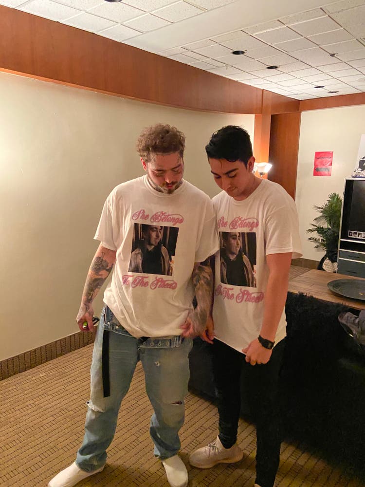 Oh my god (laughs). Basically, my friend Oliver [Cannon], shout out to him, was recording me. Me, him, and Posty’s photographer Adam [DeGross] were just there chilling. I was trying to get the attention of this girl and it ended up not working out. Posty came up to me a day after saying, “Let her go, bro. She belongs to the streets.” Oliver screenshot my face in that moment and put it on a shirt. We were thinking, “Should we print these out and give them to the whole team?” We ended up printing a bunch of them in some weird random shop deep in some sketchy mall in Montreal. We picked up 12 shirts. Tyla and everyone wore it. It was the worst day for me, but also the best day because Posty was like, “I’m going to wear this on stage.” I’m over here thinking, “Oh that’s sick.” Except, it’s making fun of me at the same time.
