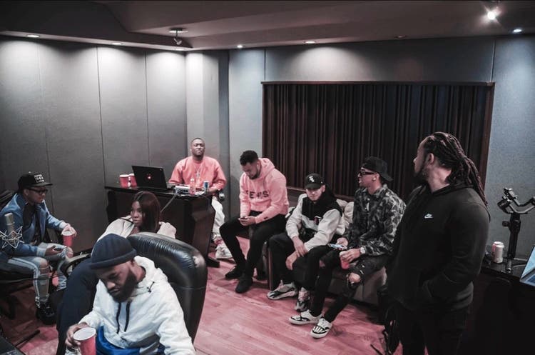 ROE (middle left) with Hit-Boy (upper left), T-Minus (upper middle left), and OG Parker (upper middle right) in City Girls writing camp