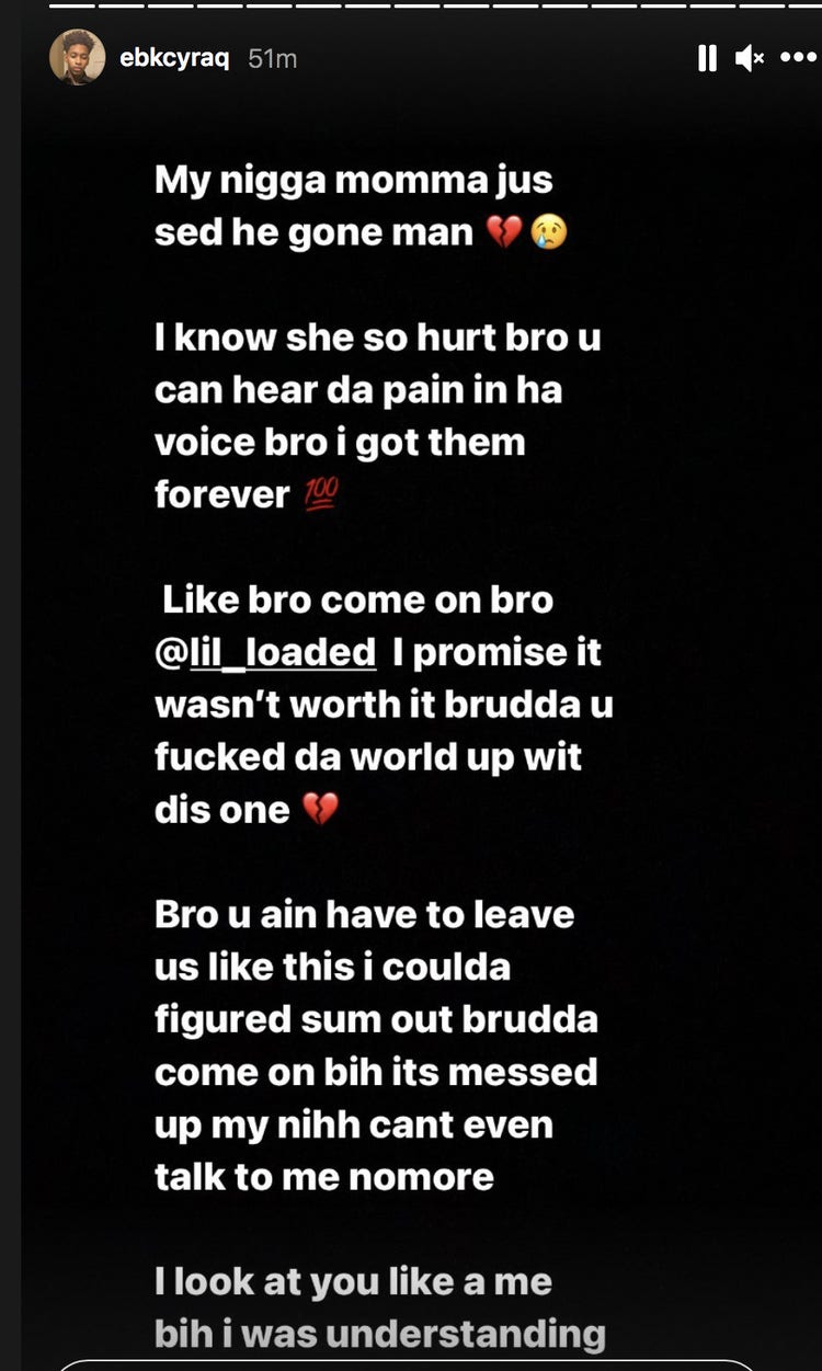 “My nigga momma just said he gone man,” he penned. “I kno she so hurt bro. I can hear the pain in ha voice….Like bro @lil_loaded, I promise it wasn’t worth it. Brudda u fucked da world up wit dis one. Bro you ain’t have to leave us like this. I coulda figured sum out brudda. Come on bih, its messed up my nihh can’t even talk to me no more.”