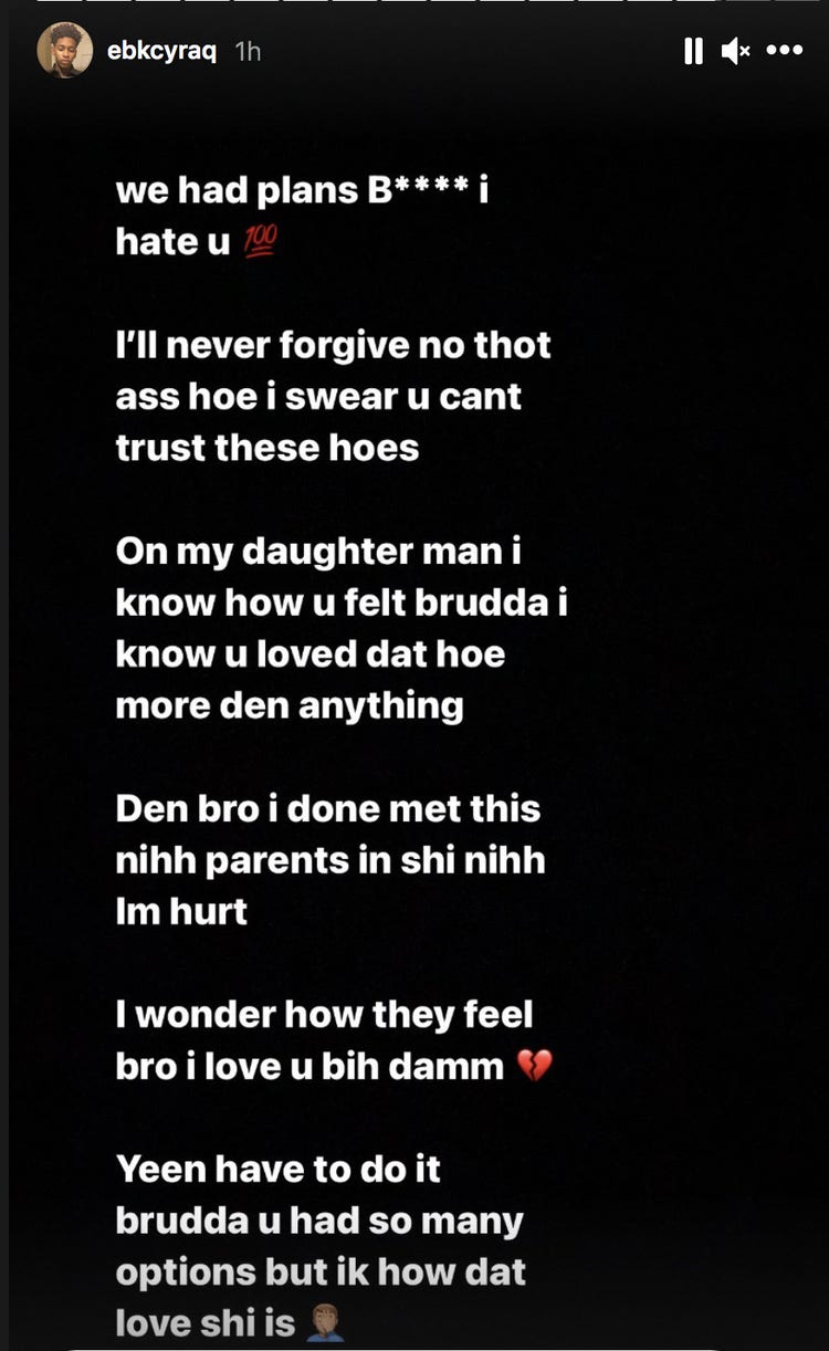 “My nigga just killed himself cause his bitch. I hate this hoe so much right now,” wrote Cyraq in the first of a series of posts on his Instagram Story. “That nihh told me inna studio last month somebody fuck his girl, he a kill em. This nihh ended this shit behind his girl. He meant that shit. Brudda I love you bih.”