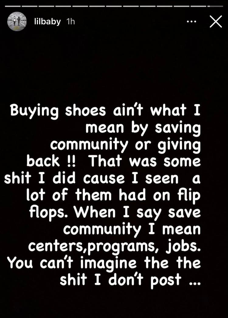 After the clip of him leaving the store with the sneakers went viral, Lil Baby took to Instagram to clarify how he wants to save his city, aside from buying footwear. “Buying shoes ain’t what I mean by saving [my] community or giving back!!” he wrote.