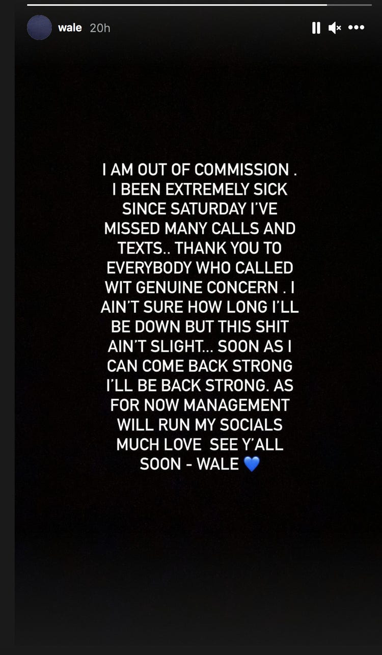 “I am out of commission. I been extremely sick since Saturday,” he wrote on his Instagram Story. “I’ve missed many calls and texts…Thank you to everybody who called wit genuine concern. I ain’t sure how long I’ll be down, but this shit ain’t slight…Soon as I can come back strong, I’ll be back strong. As for now, management will run my socials. Much love, see y’all soon.”