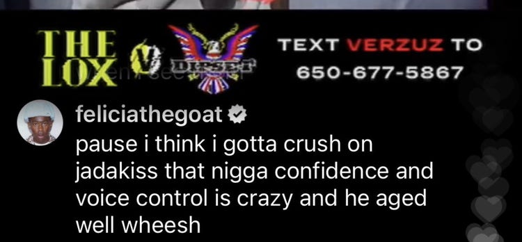 “Pause I think I gotta crush on jadakiss,” Tyler wrote. “That nigga confidence and voice control is crazy and he aged well wheesh.”