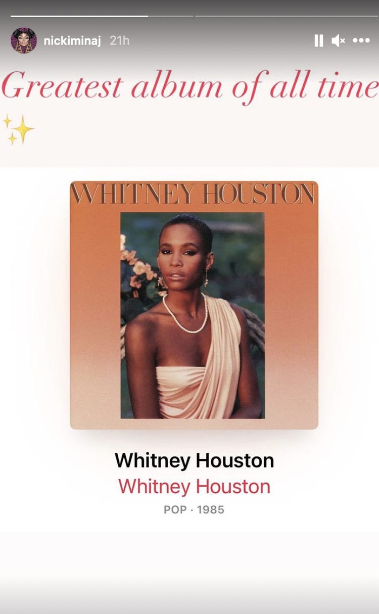 In an Instagram story she uploaded on Tuesday (Aug. 10), Nicki posted the cover for Whitney Houston’s eponymous debut album along with some bold overlain text: “Greatest album of all time.”