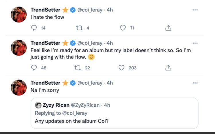 On Friday (Oct. 1), a Coi supporter took to Twitter to ask her about the status of her upcoming project. “Any updates on the album,” tweeted the fan, to which the “No More Parties” singer responded, “Na I’m sorry.” She elaborated moments later in subsequent posts.