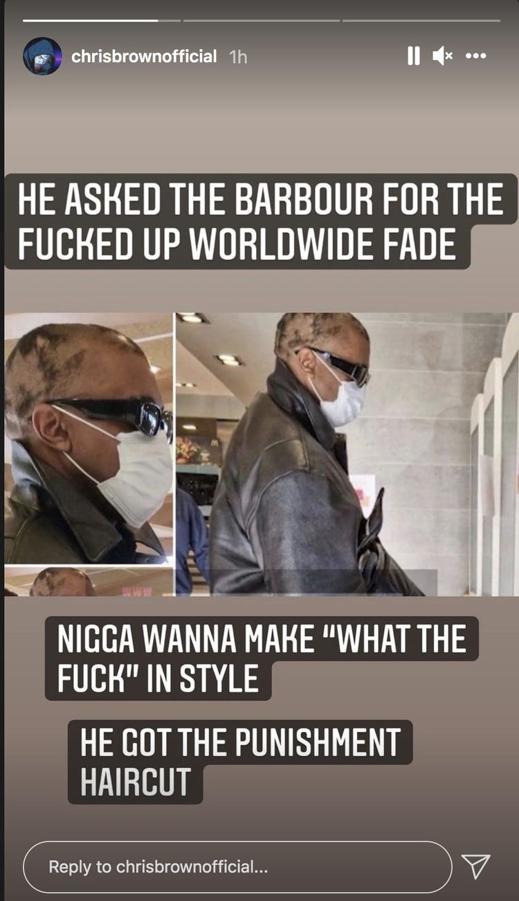 Next to a picture of Kanye’s new cut, Chris joked that the Chicago emcee “asked the barber for the fucked up worldwide fade.” “Nigga wanna make ‘what the fuck’ in style,” he went on before adding a third comment: “He got the punishment haircut.”