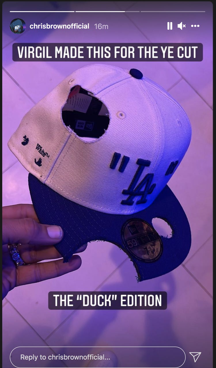 In a follow-up post, Breezy shared a photo of a damaged Los Angeles Dodgers hat, teasing that it was a creation specifically made for Kanye by his longtime friend Virgil Abloh.