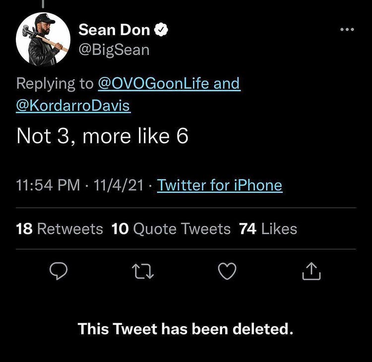 Sean tweeted — and deleted — a response to that user, writing, “Not 3, more like 6.” An image of the tweet was captured by XXL.