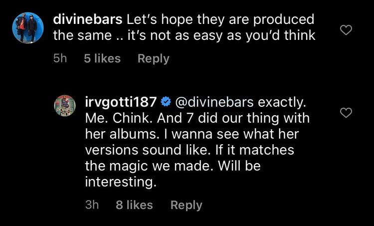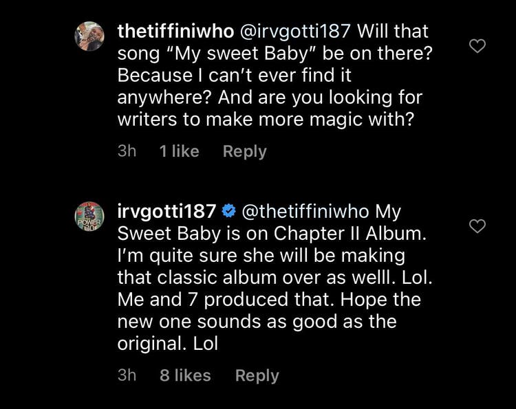 Irv then wrote that Ashanti is hoping her “loyal fans” listen to her re-recorded LP instead of the original that he owns the masters to. He also said the situation was “fucked up,” but he wants to hear what her versions will sound like to see if it “matches the magic we made.”