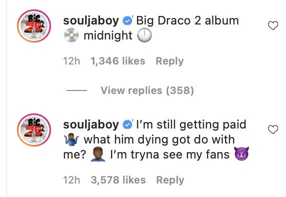 “I’m still getting paid what him dying got do with me? I’m tryna see my fans,” Soulja wrote in the comments section for the post. In a second comment, he promoted his Big Draco 2 project, which was released that same night.