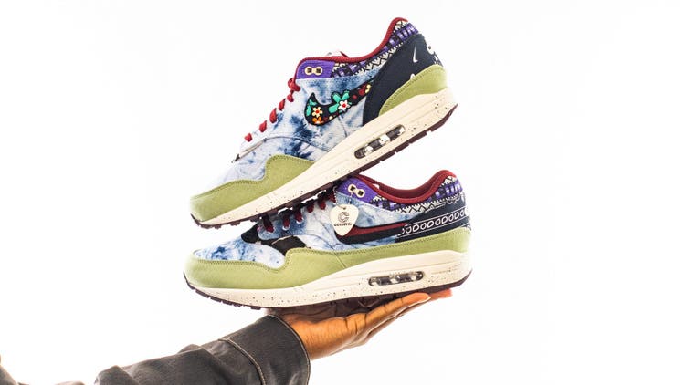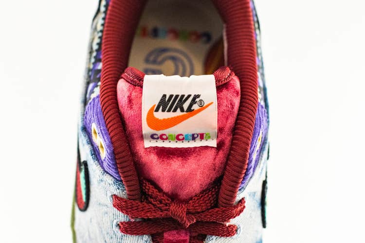As one of three Air Max 1s that Concepts and Nike worked on for their collaboration, the “Mellows” are filled with detail. According to Concepts, they were inspired by the late 1960s and early 70s youth culture — more specifically, the eras’ music festivals and eclectic style. Those eclectic elements display themselves in an olive green mudguard, patterned cowhide, denim and woven panels, and touches of velvet via the tongue. Even the iconic Nike swoosh gets a dose of upending with differing swooshes. One is a striped pattern and the other a flower power mashup. Inventive, colorful soles complete the sneaker with a bright flower-emphasized sneaker box to match.