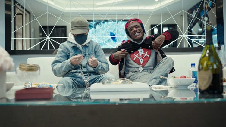 “Ain’t nobody fly as us, heavy, heavy, heavy, and you know I got it tucked, heavy, heavy, Glocky, ‘Look in the sky, it’s a bird, it’s a plane?’ Nah, I’m on a jet, why would I ever respond to a lame? Yeah, he ain’t put a check, pussy ass nigga better stay in his lane, yeah, before he get whacked, I fuck around with all my chains, and I still got space all around my neck, four-carat emeralds, can’t do baguettes, I done put on my vest…”