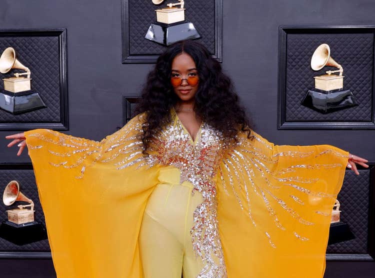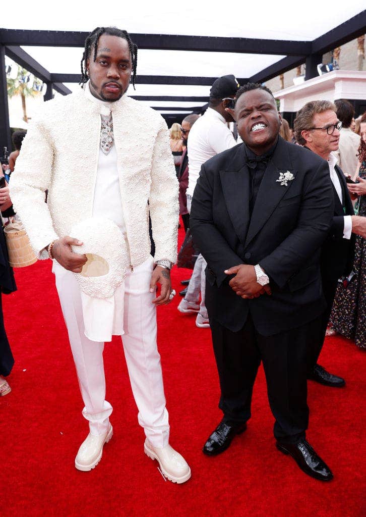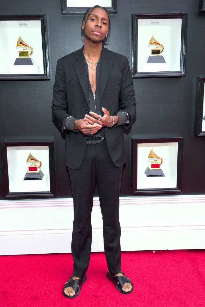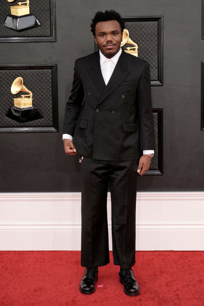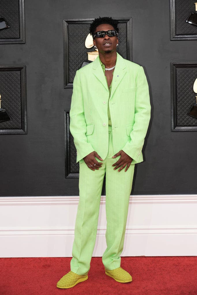 Eight-time Grammy nominee Doja Cat walked the red carpet in a sheer blue Versace gown. The “Kiss Me More” singer — who recently vowed to quit music via Twitter — chose to rock blonde hair and a bang with her look. Tonight Doja is nominated for Best Rap Song, Record of the Year, Song of the Year, Best Pop Duo/Group Performance, Album of the Year, Best Pop Vocal Album and Best Melodic Rap Performance.