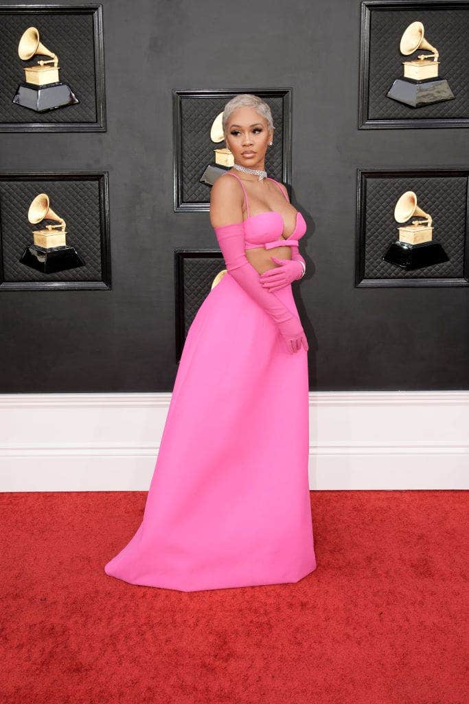 Saweetie graced the red carpet looking chic wearing a three-piece, pretty in pink ensemble. The “Icy Girl” hitmaker — who is up for Best New Artist — bared her midriff in a hot pink top, floor-length high-waist skirt and hand gloves. The look was put together by Valentino. But perhaps the best part of her look was that the “Back to the Streets” rapper brought back her short blonde hair that she debuted late last year. Saweetie’s short cut can also be seen in her “Best Friend” music video featuring Doja Cat. That track is up for Best Rap Song tonight.