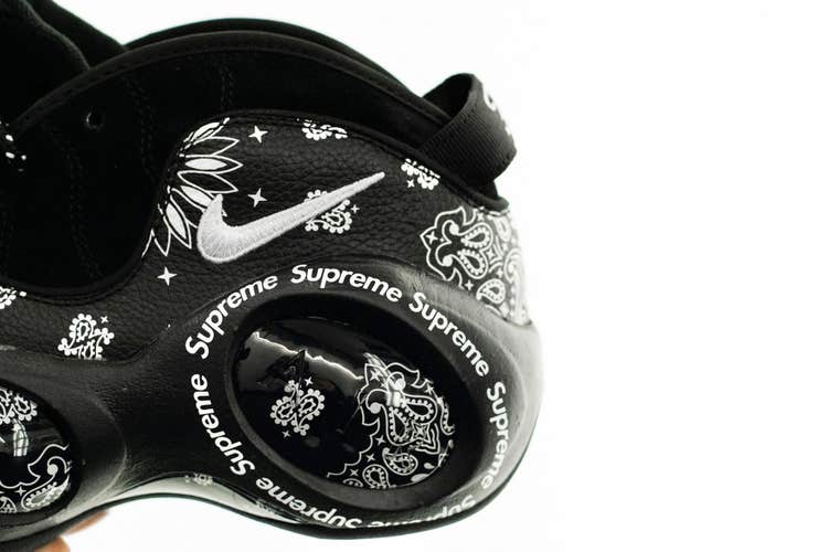 The most notable characteristics of the Zoom Flight have always been what are described as “bug eyes” (three on the lateral side, one on the medial sign) culminating with an enlarged one at the heel on the lateral side. This time, the bug eye gets a makeover with paisley in it and the infamous Supreme logo surrounding it.