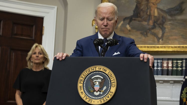 “I had hoped when I became president I would not have to do this — again,” said Biden alongside his wife, Jill Biden, a longtime teacher. “Another massacre. Uvalde, Texas. An elementary school. Beautiful, innocent second, third and fourth graders. And how many scores of little children who witnessed what happened — see their friends die, as if they’re in a battlefield, for God’s sake. They’ll live with it the rest of their lives.”