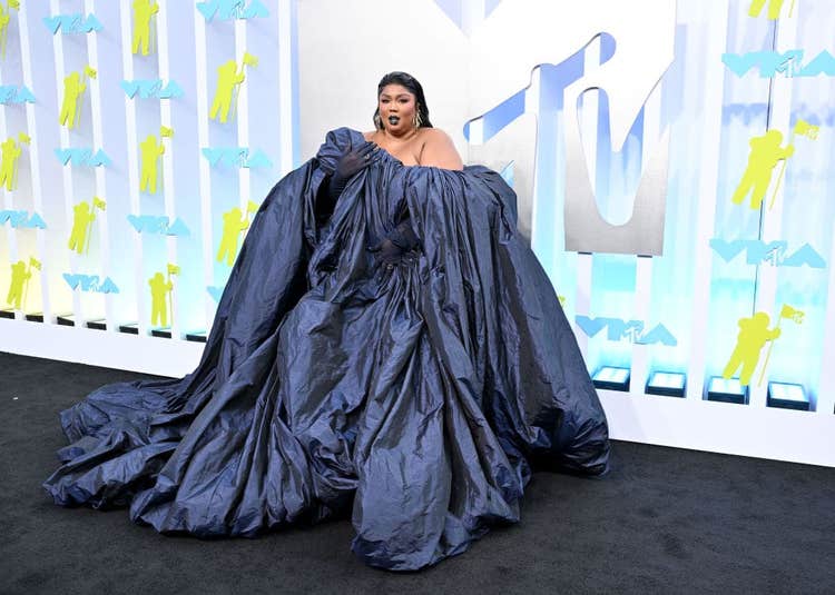 First, we have Video for Good winner Lizzo in Jean Paul Gaultier couture by Glenn Martens. Lizzo was one of the first major celebrities to hit this year’s black carpet, and she set the tone in this one-of-a-kind voluminous couture gown with slicked-back hair and dark lips to match. It’s one of her strongest red carpet looks yet.