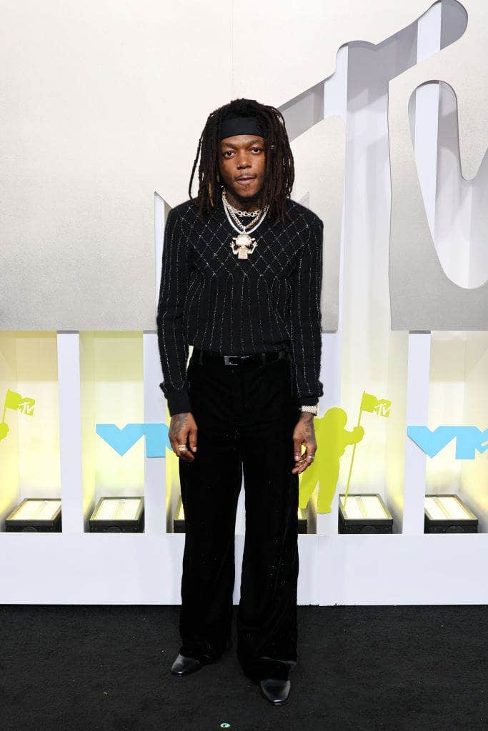 Doechii’s black leather look by Patrycja Pagas is the epitome of what VMAs fashion should look like: edgy, fun, and risky. The Swamp Princess accessorized her look with dark grills, a crystal black teddy bear purse, and matching dark eye makeup.