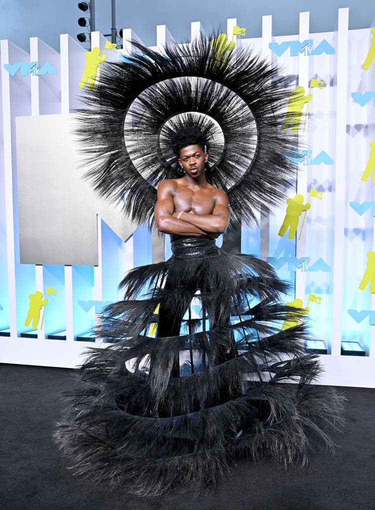 By now, we know to expect the unexpected from Lil Nas X and this look shocked me in a good way. The “Industry Baby” turned heads wearing London-based brand Harris Reed. The look consisted of a giant feathered headpiece and matching layered, tiered pants.