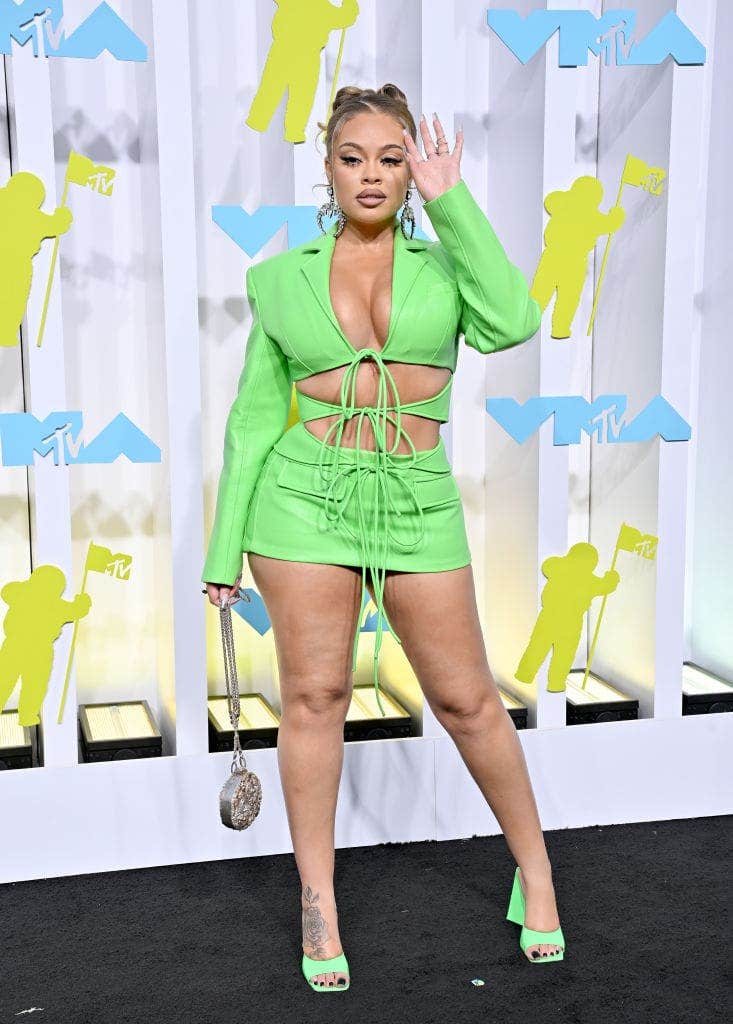 Best New Artist nominee Latto hit the black carpet in a form-fitting, lime green Ludo Bokuchava look with matching The Attico shoes. The lime green was a beautiful pop of color for her skin tone.