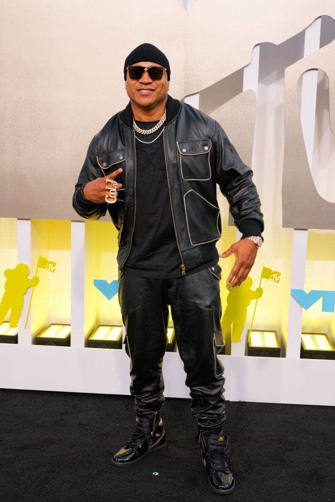 Co-host and rap legend LL Cool J kept it classic in a custom Dapper Dan x Rock The Bells leather jacket, matching pants, and the timeless black and gold AJ1s. Salute to the Queens legend!