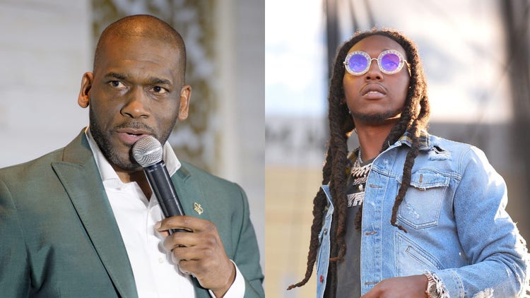 Over the weekend, an Atlanta area pastor issued a call to action in the wake of Takeoff’s tragic passing. On Sunday (Nov. 6), Jamal Bryant took to the podium at New Birth Missionary Baptist Church in Lithonia with a powerful message for young Black men. Via footage provided by WSB-TV, images of Takeoff, along with other slain rappers like PnB Rock, Young Dolph, Pop Smoke, and Nipsey Hussle, could be seen behind him as he initiated a prayer for those in the audience: