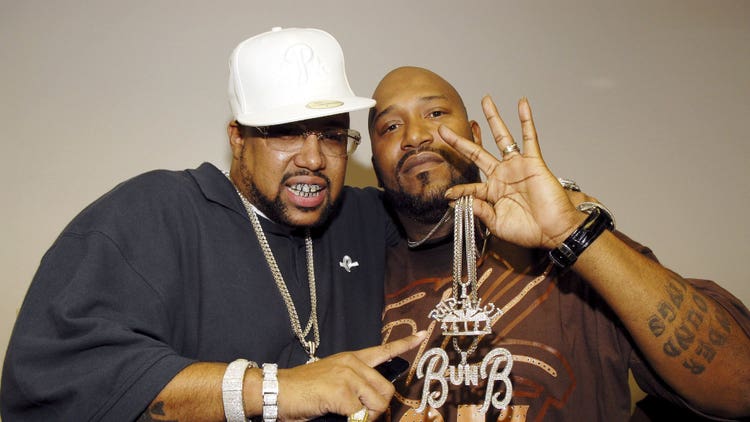 As UGK (which stands for Underground Kingz), Bun B and Pimp C were true pioneers of the Texas hip hop scene, specifically in regard to the city of Houston. Their debut album, Too Hard to Swallow, made landfall in 1992, complete with timeless cuts like “Something Good” and “Pocket Full of Stones.” The duo continued to make waves with bonafide classics like the gold-certified Ridin’ Dirty and their chart-topping self-titled LP, the latter of which contained their most commercially successful single, the OutKast-assisted “International Players Anthem (I Choose You).”