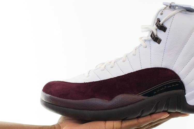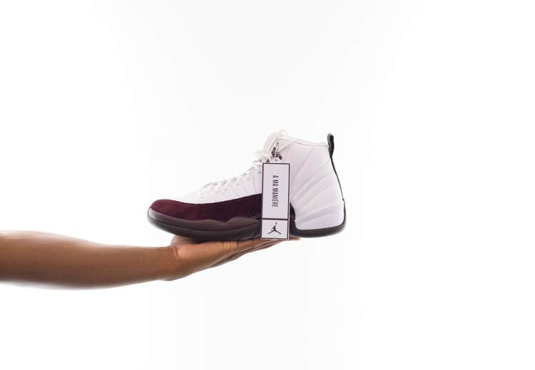 The white and burgundy pair features a smooth, white tumbled leather upper with a burgundy suede panel atop its rubber mudguard from the midfoot to the toe. Although the XII, first released in 1996, is one of the most simplistic Air Jordans design-wise, it doesn’t lack style or details. For this pair, the A Ma Maniére team upped the ante with co-branded tagging starting with their “A” insignia on the tongue, the metal eyelets, and a crisp white co-branded hang tag. Its back heel strip is also updated to feature text highlighting AMM’s ethos of quality products inspired by culture accompanying the standard Jordan text.