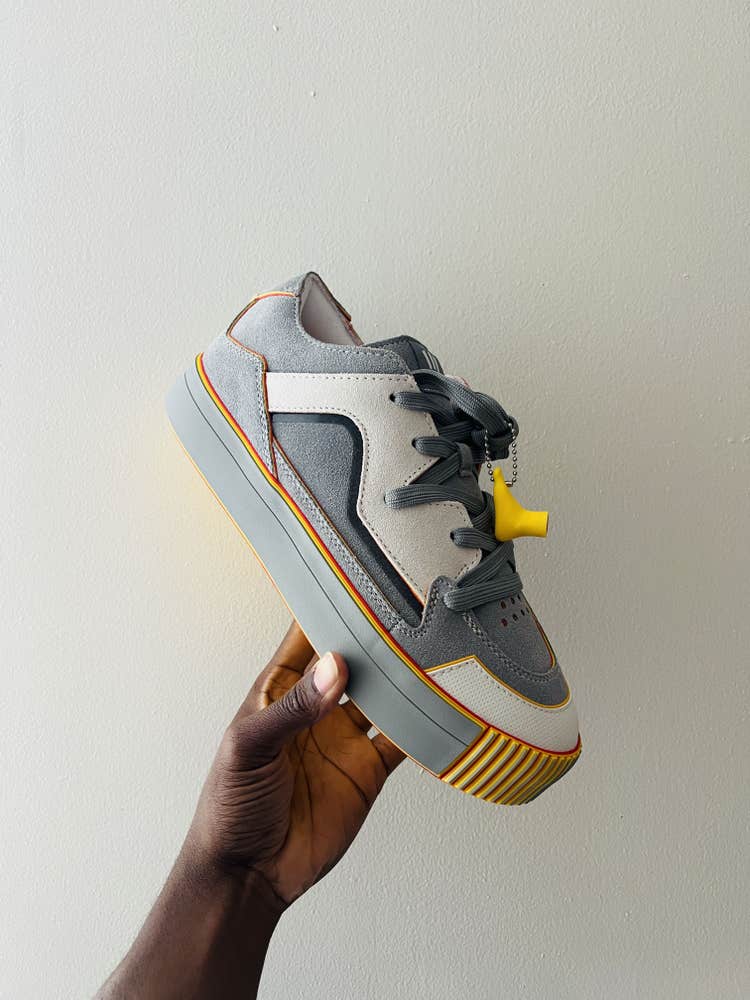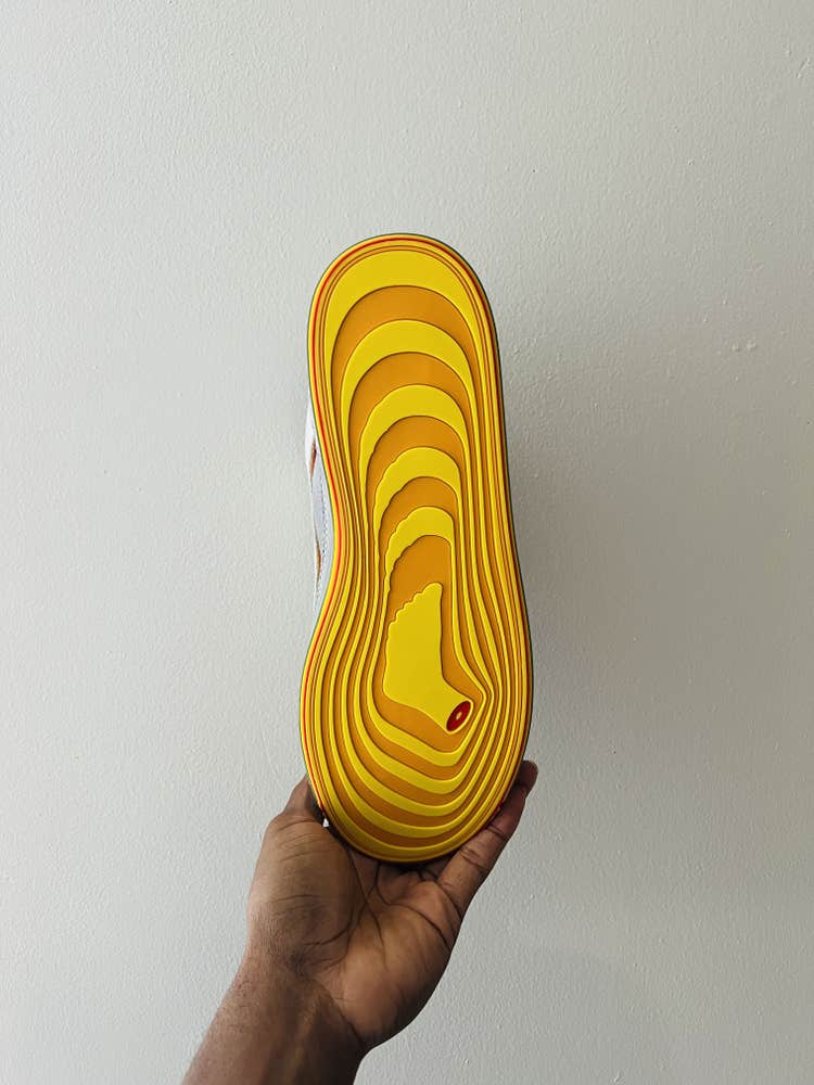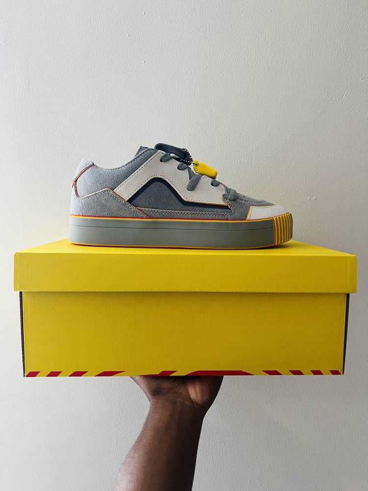 As the second release in their Gobstomper series, the “Graylag Goose Edition” features a gray suede outer and triple microfiber under-layer with red and yellow lining throughout the sneaker. An interesting quality here is that every part of the Gobstomper is made of four layers of material — from the tongue, to the upper, to the sole — that reveal themselves as you wear down the sneakers. MSCHF is encouraging you to tear this sneaker apart, and they even included a Dremel to help speed up the process. Additional details include a three-exclamation point logo on the tongue, their foot logo on the back heel, and MSCHF printed on the back midsole. My favorite part of the sneaker is the insole and outer sole featuring a hypnotic blend of orange, red, and yellow swirling around a MSCHF foot housed in a yellow sneaker box to match.