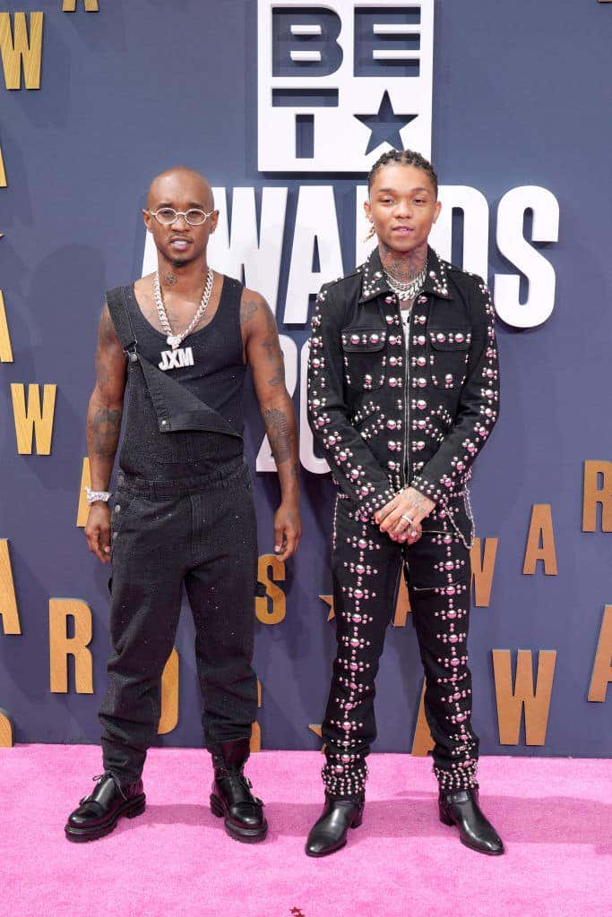 8. Slim Jxmmi and Swae Lee of Rae Sremmurd hit the pink carpet in coordinating black looks. Slim opted for a studded jumpsuit while Swae Lee went with a more embellished look.