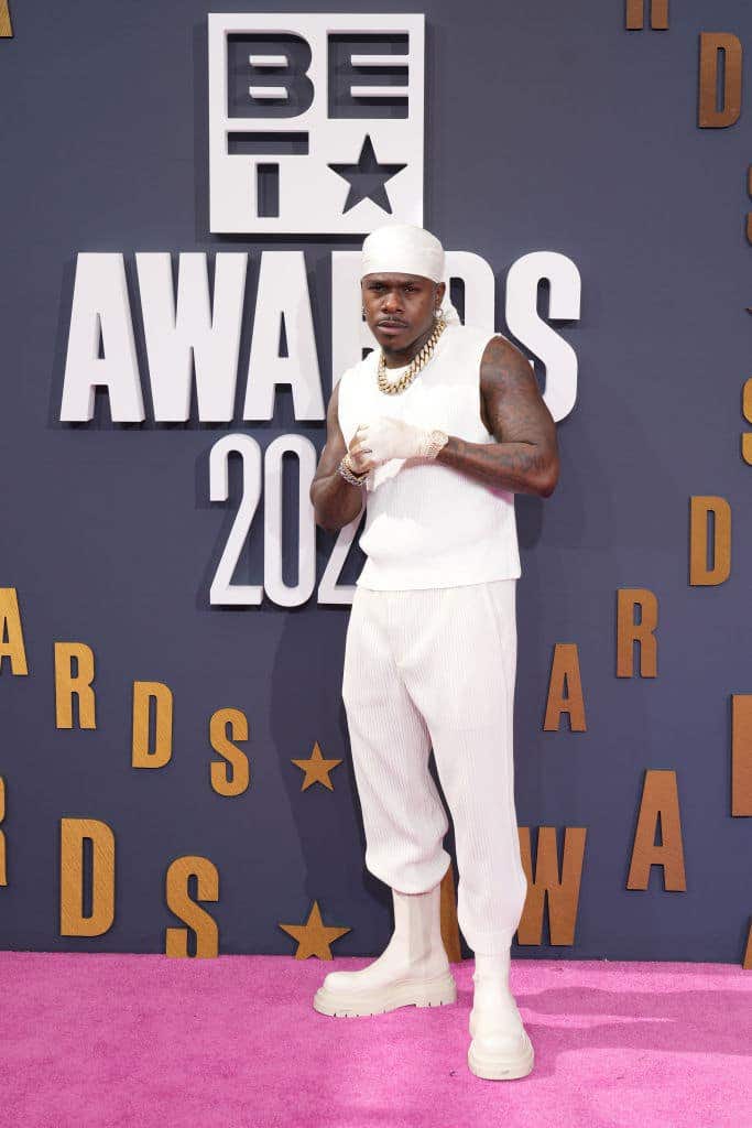 12. DaBaby kept it cool in a cream-colored look that consisted of a sleeveless top and Issey Miyake pants tucked into Bottega Veneta boots with a cream glove and matching head scarf.