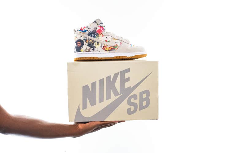 The Dunk High “Rammellzee” features the artist’s self-titled Gothic Futurism style, which is distinguished by its illegible writing and bright colors. The pair’s upper is a light beige canvas with suede overlays on the toe, tongue, heel tab, and the Swoosh. The vibrant artwork of RAMMELLZEE can be found throughout the pair with each sneaker showcasing different characters from the late artist’s world, most recognizable on the toe box and back heel. Finishing details include the Nike SB logo on the tongue, a gold Supreme lace lock that recalls features of the brand’s early Nike SB collabs from the 2000s, a brown rubber sole, and the classic beige Nike SB sneaker box.