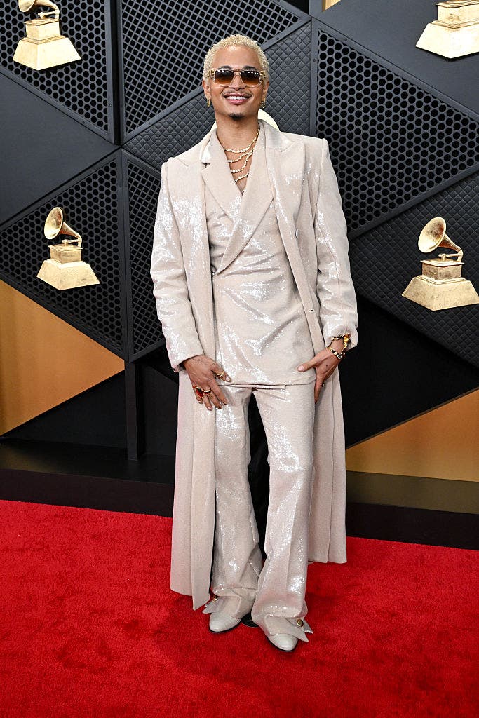 Destin Conrad made his Grammys red carpet debut in a standout, crystalized beige, double-breasted suit with a matching floor-length jacket. He accessorized with multiple gold chains and a gold cuff! What a way to make an impact.