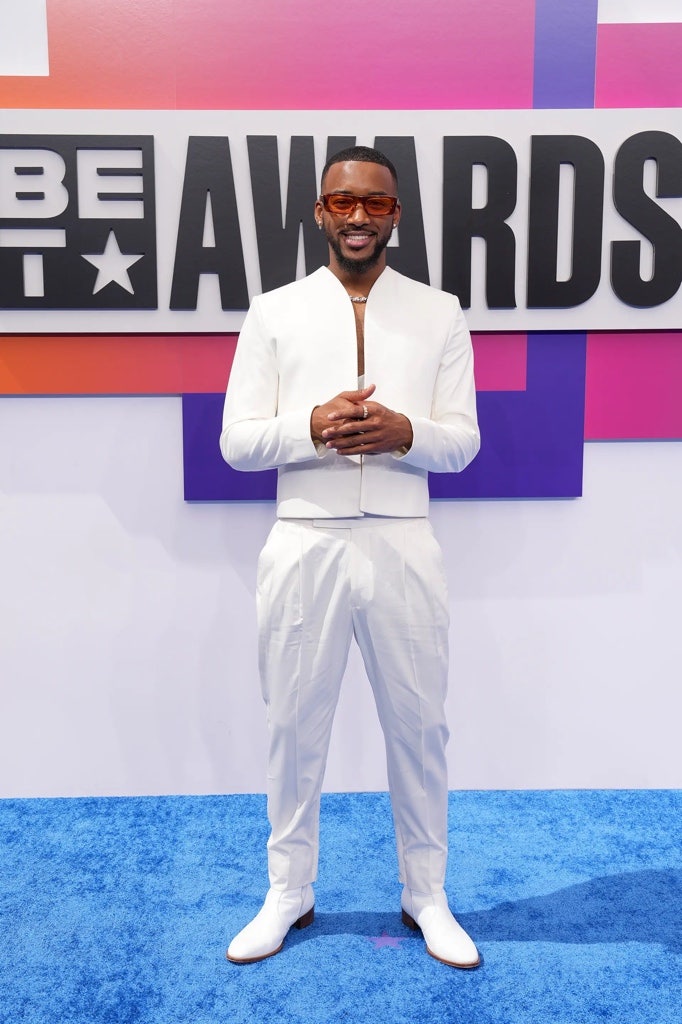 Actor Algee Smith opted for an all-white fit for the blue carpet, effectively setting him apart from all the other looks of the night. His outfit featured a cropped waistcoat with a cummerbund and pleated pants. He finished the look with tinted sunglasses, white boots, and silver jewelry.
