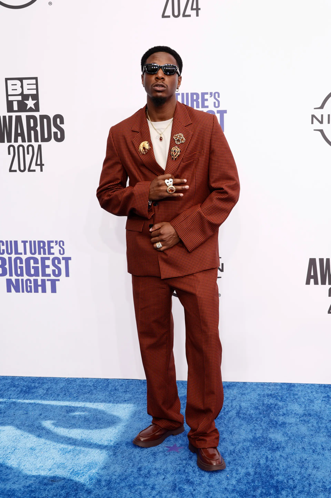 Rapper and actor Joey Badass wore a brown suit by Botter that he accessorized with intricate gold jewelry on the lapels. He completed the look with black sunglasses, his signature flat-top fade, and gold rings.