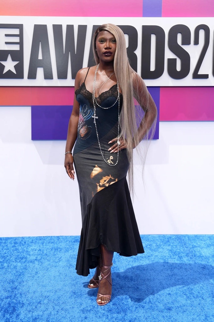 Rapper Doechii hit the carpet in a slip dress with lace straps featuring graphics throughout. She accessorized with multi-strand pearl chains, pink heels, and blonde hair.