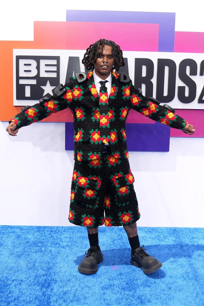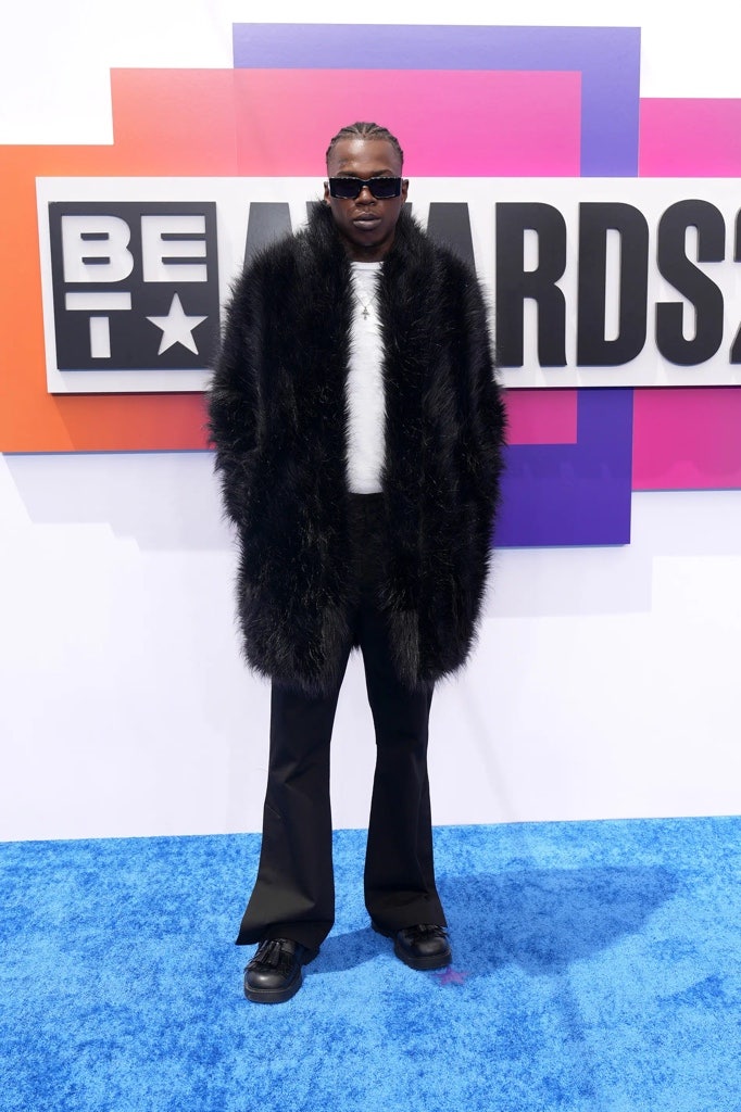Jamaican Rapper Skillibeng hit the carpet in a fashionable and sleek look featuring a black fur jacket, white t-shirt, and fitted trousers. He completed the look with black sunglasses, shoes, and a small diamond cross.