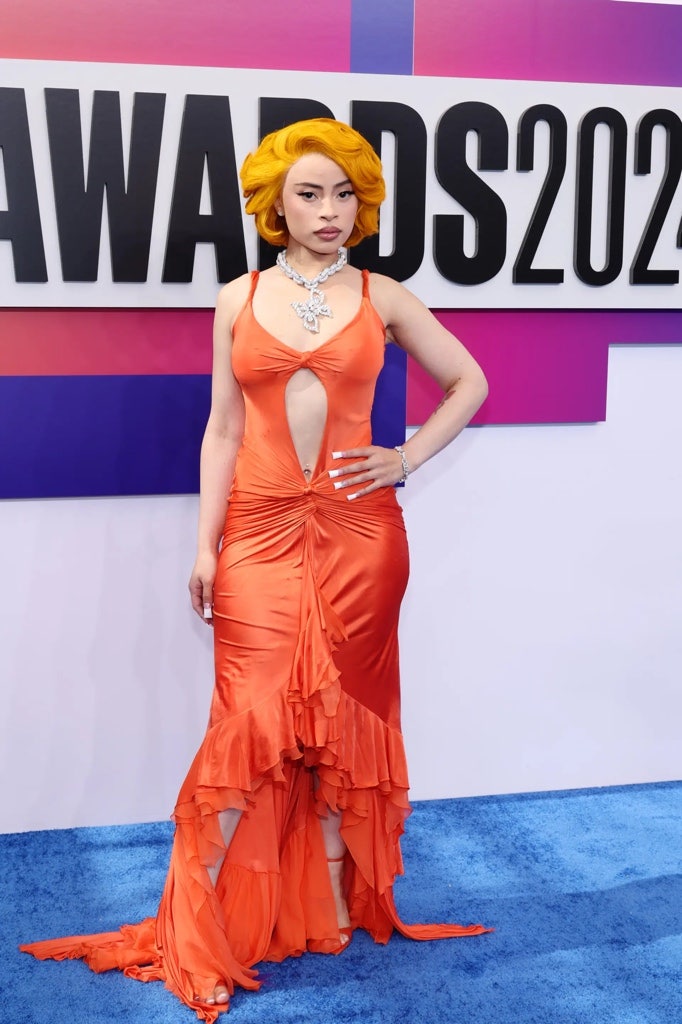 Bronx rapper Ice Spice continues her nostalgia-inspired carpet looks by wearing an orange archival Versace spring/summer 2004 dress. She completed the look with a GRWN diamond “Metamorphosis” couture necklace by designer Aleali May, matching orange heels, and a brightly colored tousled bob.