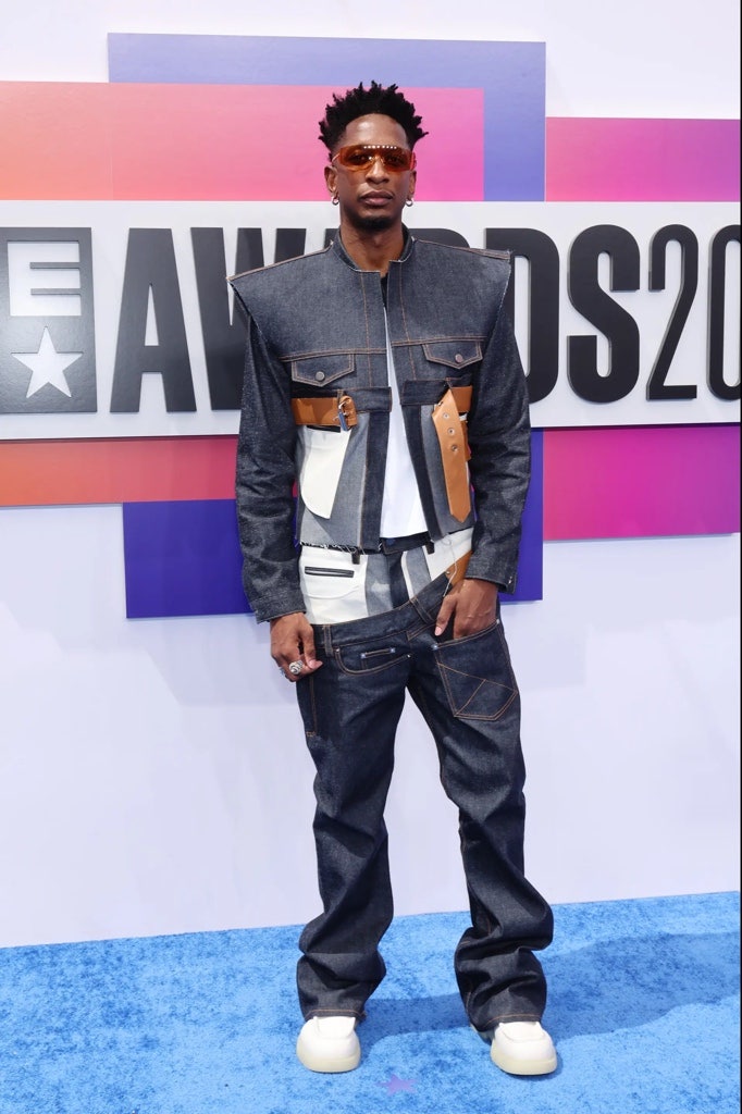 Stylist to the stars Kollin Carter hit the blue carpet in a custom denim look by L.A.-based designer and tailor extraordinaire Jagne. The custom denim look featured structured shoulders and inside-out denim panels. He completed the picture with tan sunglasses and white shoes.