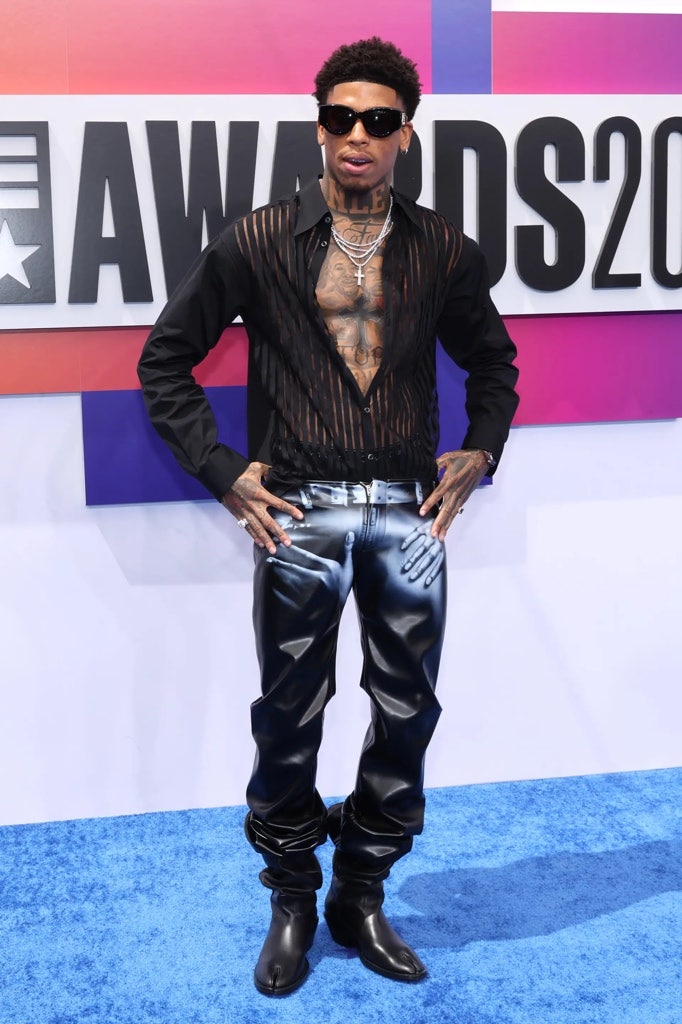 Breakout Rapper NLE Choppa wore a black paneled sheer shirt, Mowalola leather pants with graphics, and black Maison Margiela boots. Rockstar and edgy vibes.