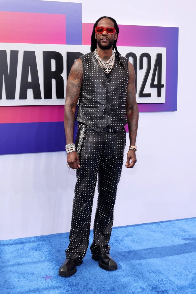 You can never go wrong with a studded black leather set as rapper 2 Chainz proved with his blue carpet look. He accessorized with diamond bike chains, jewelry, red sunglasses, and Balenciaga shoes.