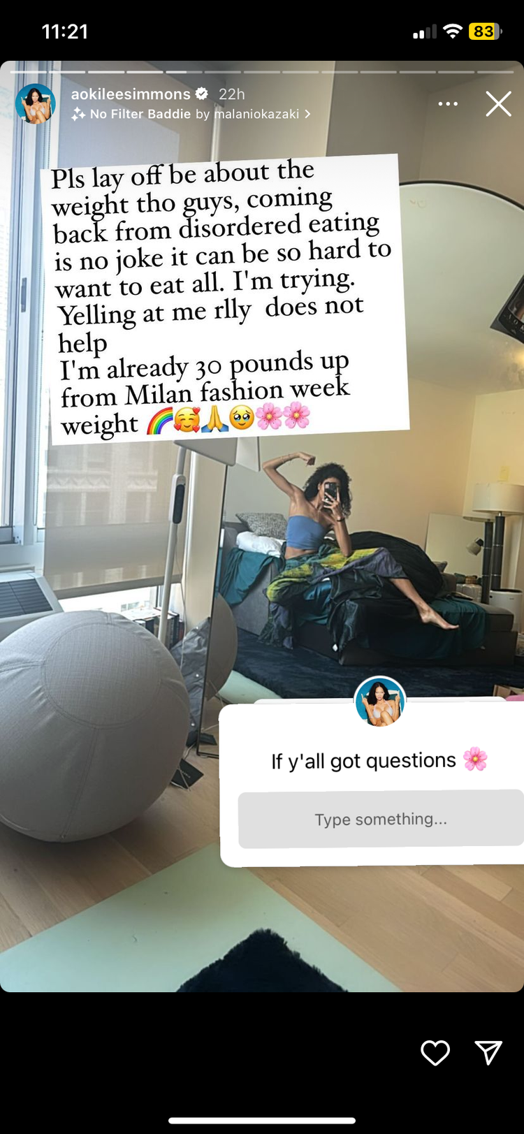 Simmons detailed her decision in subsequent posts. “I know lots, in fact, most models go through so much more including my own mama, but it’s not for me. I’m a personal person, I take things personally. I’m honest and open and take things hard when I feel I was kind and received genuine cruelty (I don’t just mean not booking a job cause that’s life!) but interpersonal cruelty. It was dark AF. And then from this dark, virtually starving place, I made a bad decision after being coerced for years and the entire internet (24 million hits if I recall correctly) dragged me through the mud for it. I was doing my best,” Aoki wrote.