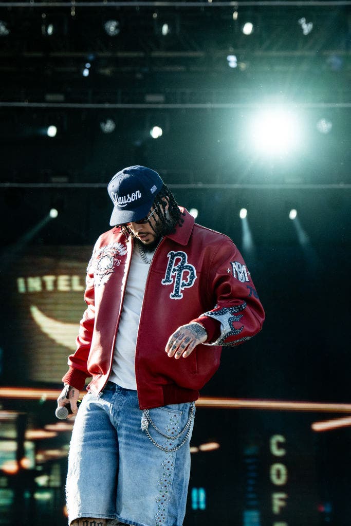 The hooper-turned-rapper took the stage in a red Pelle Pelle coat that had silver-studded details, black and grey leather flames on the left arm, patches on the side, and the full Pelle Pelle logo emblazoned on the back. Keeping the jacket as the main attraction, he paired it with a white tee and light-wash denim shorts featuring diamond lining along the outer hem. The fit was finished off with a black-and-white Slauson hat and low-top Jordan 1s — because when you’ve got a jacket this bold, the footwear has to match. GELO’s look was equal parts fire and finesse, proving that he’s not just here to perform — he’s here to make a statement in every sense.