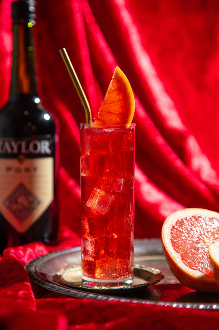 Next, let’s make the “Port of Paloma.” With this cocktail, we’re recreating a classic Paloma with a Port twist. Using mainly fresh grapefruit and lime, this is a lower-proof drink. If you’re easing out of Dry January, this is the one you want. Let’s set the self-care mood: It’s you enjoying a glass with vinyls playing in the background, while you create a vision board full of your 2025 glow-up plans. If you’ve got a boo, include them too.