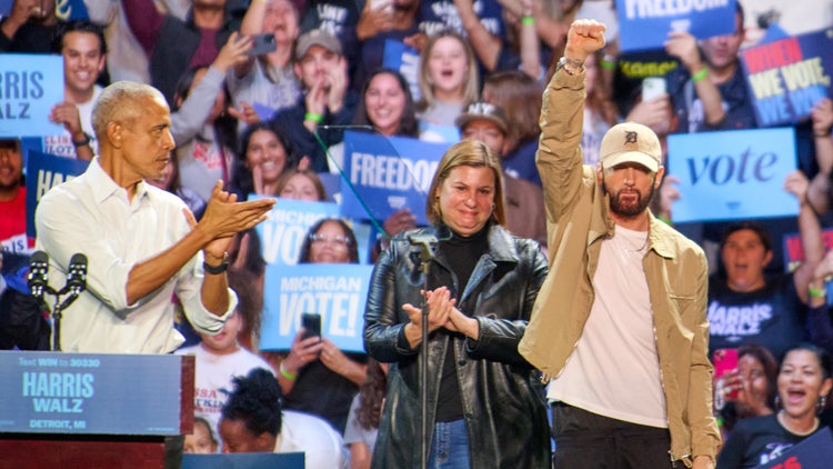 On Tuesday (Oct. 22), Eminem took to the stage at Vice President Kamala Harris’ campaign rally in his hometown of Detroit, Michigan. The Hip Hop legend spoke on freedom of speech and his support for the 2024 Democratic presidential nominee.