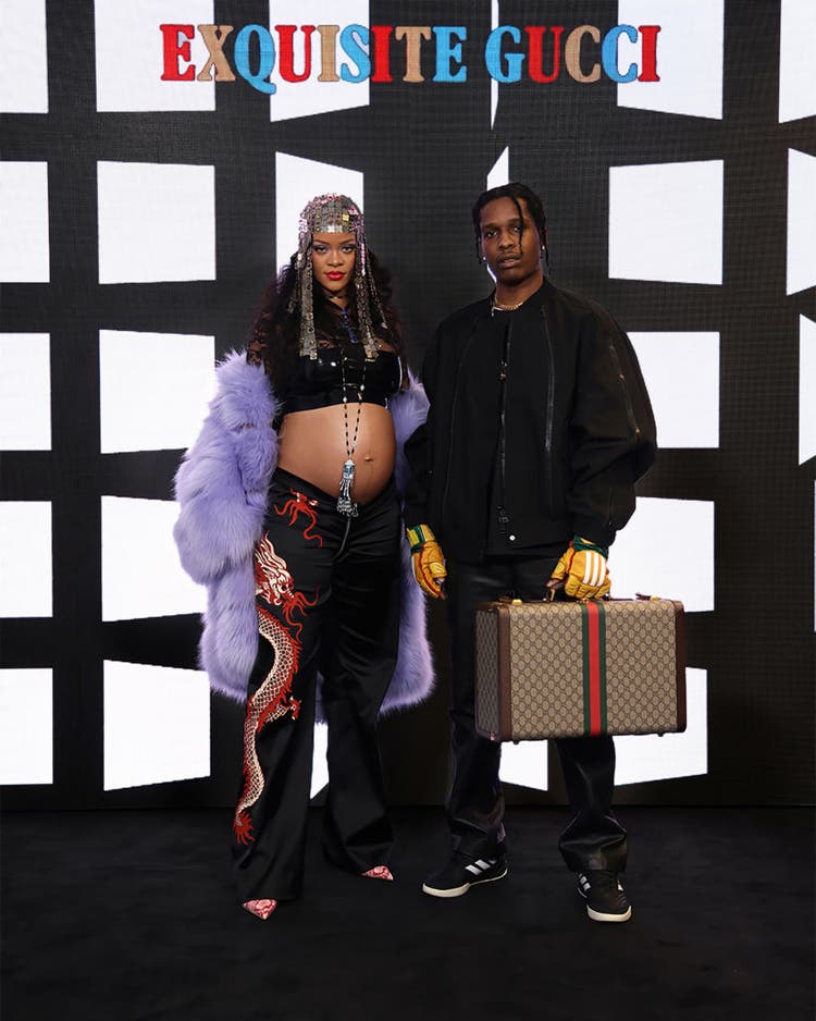 What do we call two fashion killers? Back in 2022, Rihanna and A$AP Rocky arrived at Gucci’s Exquisite Gucci show during Milan Fashion Week. RiRi showed off her first-ever baby bump in a cropped black top, dragon-print pants, and a lavender fur coat, topped with a jeweled headpiece, while Rocky kept it clean in an all-black look, leather gloves, and a Gucci monogram travel case.
