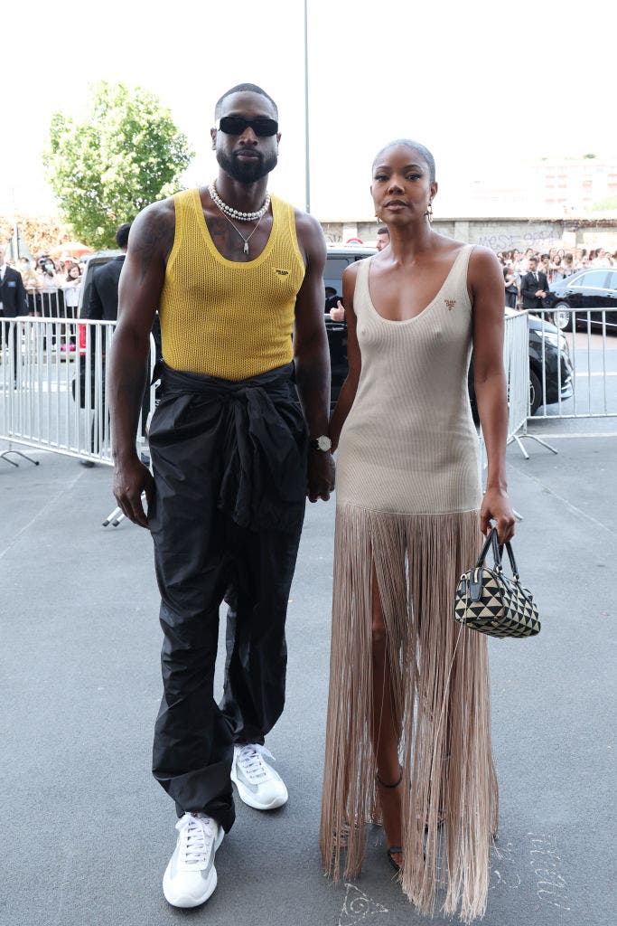 Dwyane Wade and Gabrielle Union-Wade arrived at a Prada show during Milan Fashion Week in 2022 wearing head-to-toe Prada looks. The former NBA star wore a yellow ribbed tank layered with wide-leg trousers tied at the waist, finished with white Prada America’s Cup sneakers, one of the fashion house’s most recognizable styles. His wifey stepped alongside in a fitted, fringed dress that swayed as she walked, carrying a patterned handbag and keeping the focus on motion.