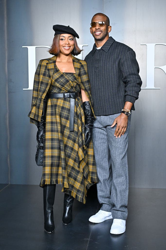 Chris Paul and his wife, Jada Paul, stepped into the Dior Homme menswear show in 2025 with ease. Jada wore a belted plaid dress layered with a matching jacket, finished with a beret, leather gloves, and leather boots that felt straight out of a Paris street scene. Paul matched the tone in a textured jacket, tailored trousers, and sneakers, keeping it relaxed but intentional. Together, they blended in the best way — polished and very at home in the city of love.