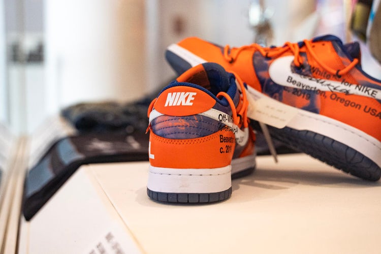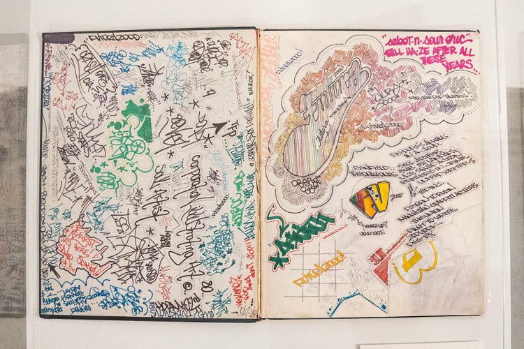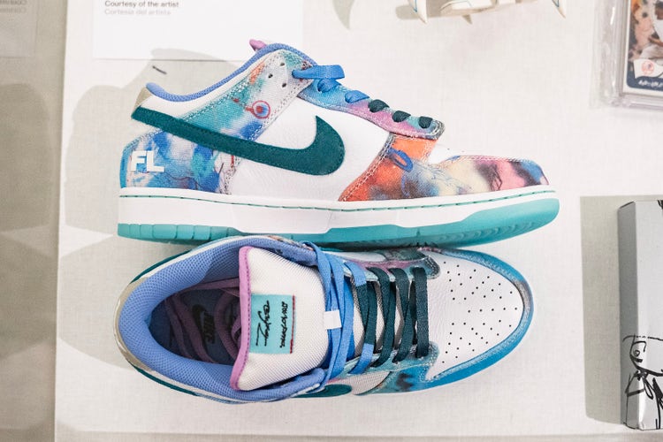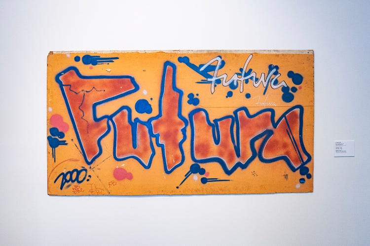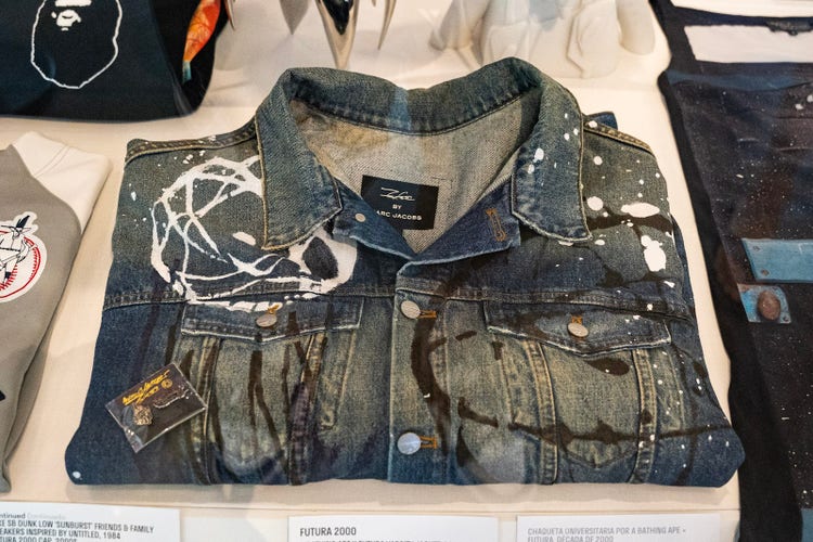 Upon entering the retrospective, one immediately falls into the world of FUTURA, with huge floor-to-ceiling artworks covering multiple walls and different glass encasings dedicated to displaying his collaborative works with contemporary culture and fashion designers. All his Off-White C/O Virgil Abloh x FUTURA x Nike Dunk Low sneakers are present -- the ones from Off-White S/S 2020, never released but unearthed from the vault, and his most recent Nike Dunk Low collaboration that dropped earlier this year next to articles of clothing from the artist’s new collaboration with fashion house Marc Jacobs. In each of these efforts, FUTURA lent his design prowess and unique artistic abilities, highlighting how seamlessly he has permeated modern culture. For proof, all one had to do was look around at what visitors were wearing and you would see different versions of his Nike Dunks and other branded works with designers like Comme des Garçons.